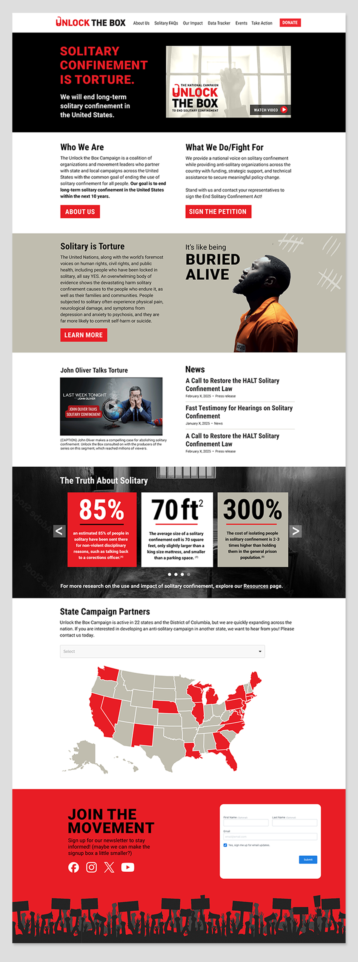 Unlock the Box is a national advocacy campaign aimed at ending solitary confinement in all prisons, jails, and detention facilities, and bringing the U.S. into full compliance with the United Nation Mandela Rules. I was contracted to update their logo and present options for a visual refresh of their website.