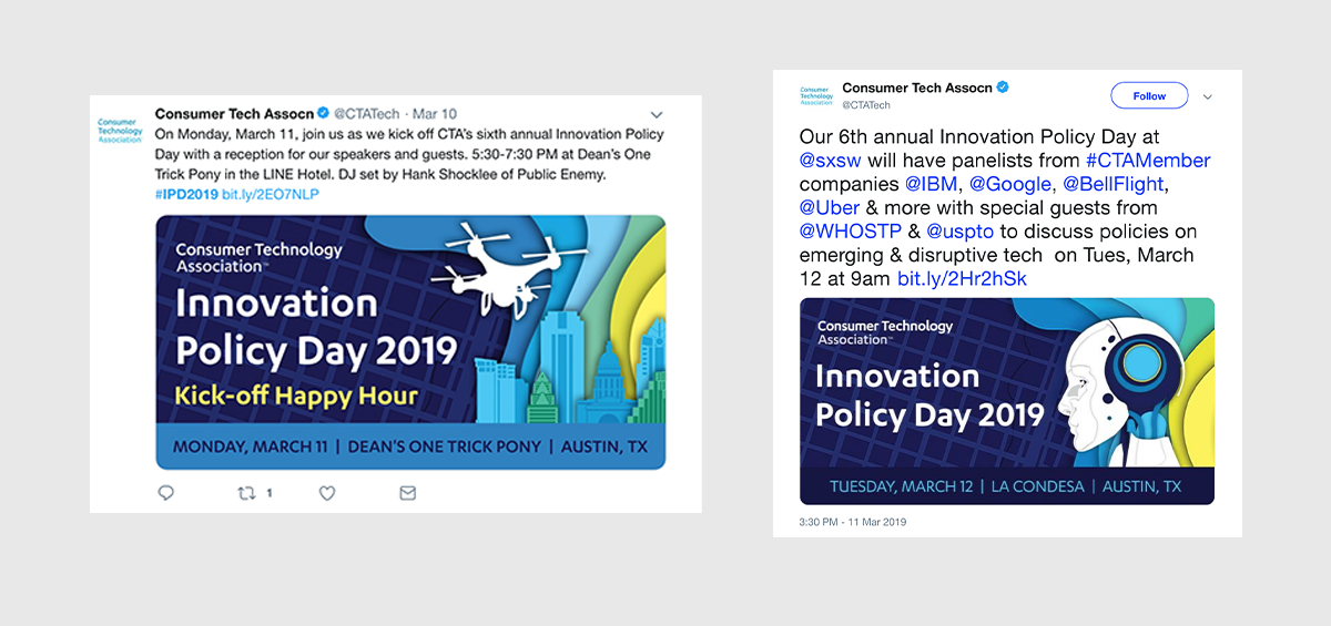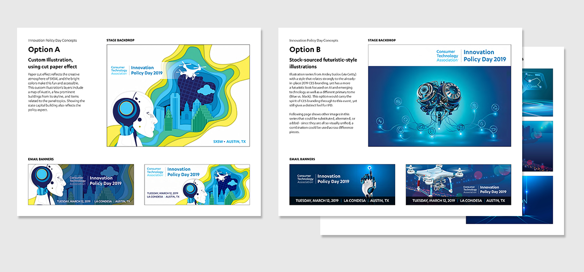 I contracted with the Consumer Technology Association to create a custom, on-brand visual identity for their 2019 Innovation Policy Day at SXSW.