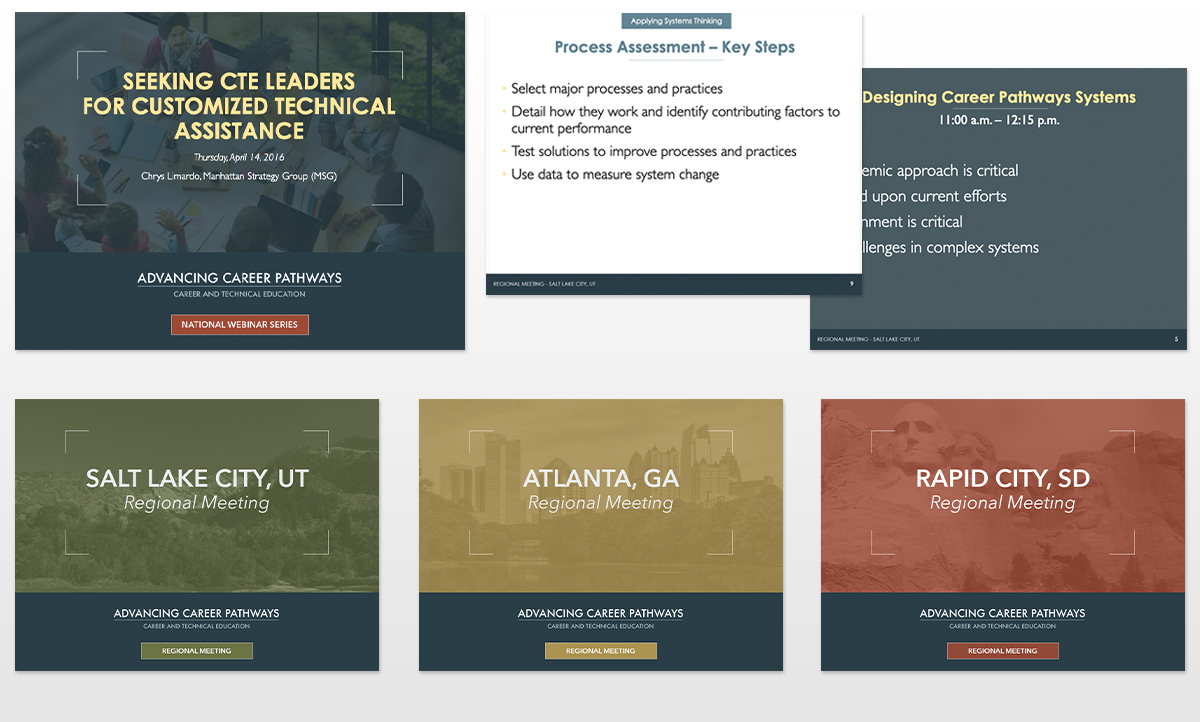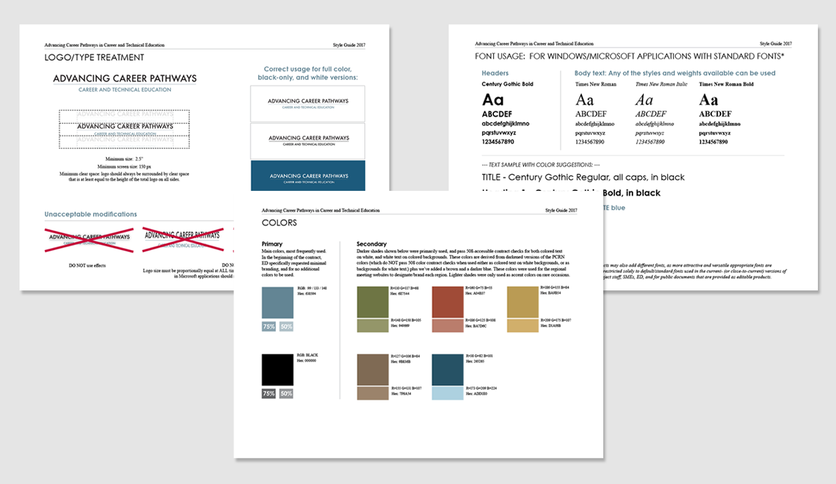 Visual identity system and print materials for U.S. Department of Education initiative "Advancing Career Pathways". I designed a text treatment logo, style guide, project reports, Powerpoint templates for use by project staff, web graphics and more, within a shoestring creative budget. The project required a conservative, corporate look that needed to stand on its own as well as align with an overarching agency brand.